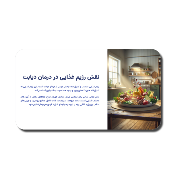 • استفاده از نمودارها و تصاویر برای نمایش اطلاعات: نمودارها و تصاویر مرتبط با دیابت می‌توانند به شما کمک کنند تا اطلاعات خود را به‌طور بصری و قابل فهم‌تر ارائه دهید.