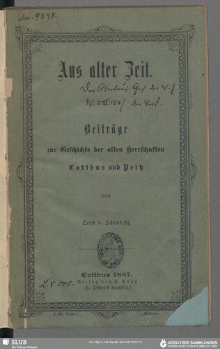 | عنوان اصلی | Aus alter Zeit. Beiträge zur Geschichte der alten Herrschaften Cottbus und Peitz |