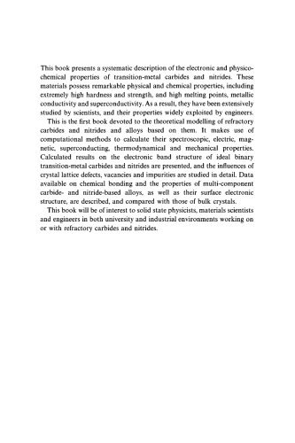 این کتاب توصیفی سیستماتیک از خواص الکترونیکی و فیزیکی و شیمیایی کاربیدها و نیتریدهای فلزات واسطه ارائه میکند. این بحث به مدلسازی نظری کاربیدها و نیتریدها و آلیاژهای دیرگداز بر اساس آنها اختصاص دارد و نویسندگان به طور منحصربهفردی از روشهای محاسباتی برای محاسبه خواص طیفسنجی، الکتریکی، مغناطیسی، ابررسانا، ترمودینامیکی و مکانیکی آنها استفاده میکنند.