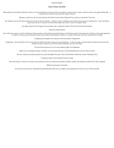در هر روز معین، از هر چهار آمریکایی، یک نفر غذای سریع و ارزان را در یک غذای سریع انتخاب می کند. رستوران غذا، بدون اینکه به سرعت و صرفه جویی آن فکر کنید. فست فود آنقدر در همه جا موجود است که اکنون مانند پای سیب آمریکایی و بی ضرر به نظر می رسد. اما تلاش این صنعت برای تثبیت، همگن سازی و سرعت، رژیم غذایی، چشم انداز، اقتصاد و نیروی کار آمریکا را به طور اساسی تغییر داده است، اغلب به روش های مخربی. اریک شلوسر، روزنامهنگار برنده جوایز، افشاگری جاهطلبانه و در نهایت ویرانکنندهاش را با مقدمهای از نماد شکنان و افرادی که دبیرستان را ترک میکنند، مانند هارلان سندرز و برادران مکدونالد، که برای اولین بار اصول خط مونتاژ کارخانه را در یک آشپزخانه تجاری به کار بردند، باز میکند. . با این حال، او به سرعت به همراه کارگران نوجوانی که بیش از حد کار می کنند و دستمزد کمتری دریافت می کنند، پشت پیشخوان، به مزارع کارخانه ای که در آن سیب زمینی و گوشت گاو کشت می شود، و به کشتارگاه هایی که توسط شرکت های بزرگ بسته بندی گوشت اداره می شود، حرکت می کند. Schlosser از شما می خواهد که بدانید چرا سیب زمینی سرخ کرده طعم خوبی دارد (با بازدید از بزرگترین شرکت طعم دهنده جهان) و “در واقع بین آن نان های کنجدی چه چیزی در کمین است”. به معنای واقعی کلمه مدفوع در گوشت شماست.