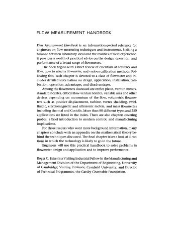 این جلد یک مرجع اطلاعاتی برای مهندسین در مورد تکنیک‌ها و ابزار اندازه‌گیری جریان است. این ابزار مفید با ایجاد تعادل بین ایده‌آل آزمایشگاهی و واقعیت‌های تجربه میدانی، توصیه‌های عملی زیادی در مورد طراحی، عملکرد و عملکرد طیف وسیعی از فلومترها ارائه می‌کند. کتاب با مروری کوتاه بر اصول مکانیک سیالات، نحوه انتخاب فلومتر و انواع روش های کالیبراسیون آغاز می شود. هر یک از فصل های زیر به دسته ای از فلومترها اختصاص دارد و شامل اطلاعات دقیق در مورد طراحی، کاربردها، نصب، کالیبراسیون، عملکرد و مزایا و معایب است. از جمله فلومترهای مورد بحث عبارتند از: صفحه سنج دهانه ای، ونتوری متر و نازل های استاندارد، نازل های ونتوری جریان بحرانی، فلومترهای جابجایی مثبت، فلومترهای توربین و مربوطه، فلومترهای گردابی و سیال، فلومترهای الکترومغناطیسی، فلومترهای اولتراسونیک و فلومترهای کوریولیس. همچنین اندازه گیری جریان جرم با استفاده از سنسورهای متعدد، دبی سنج های حرارتی، دستگاه های حرکت زاویه ای، پروب ها و سیستم های کنترل مدرن پوشش داده شده است. بسیاری از فصل ها با ضمیمه ای در مورد نظریه پشت تکنیک های مورد بحث به پایان می رسند. این یک مرجع ارزشمند برای مهندسان شاغل خواهد بود و همچنین مورد توجه محققان مهندسی مکانیک، شیمی و هوافضا خواهد بود.