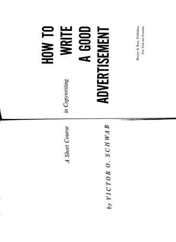 «ماده مخفی» که تبلیغات خوب را از تبلیغات متوسط ​​متمایز می‌کند، توسط نویسنده باسابقه ویکتور او. شواب در کتاب جذاب خود، چگونه یک تبلیغ خوب بنویسیم، فاش شده است. شواب نشان می‌دهد که چگونه یک صاحب کسب و کار کوچک متوسط ​​می‌تواند از آژانس‌های تبلیغاتی پرهزینه اجتناب کند. با توسعه تبلیغات پولساز خودش. برای نوشتن تبلیغاتی که خواننده را وادار به توقف و توجه کند، نیازی به آژانس تبلیغاتی ندارید. تبلیغاتی که از صفحه خارج می شوند و توجه را به خود جلب می کنند. تبلیغاتی که می توانند پول در بیاورند – برای شما!”