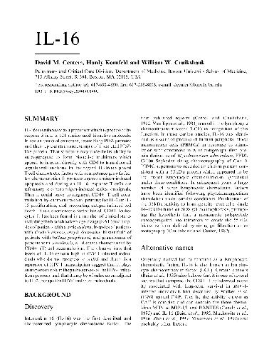 [پیش ساز L-16issynthesizedasa که توسط کاسپاز 3 به یک مولکول فعال زیستی 121 اسید آمینه تبدیل می شود. این یک ساختار غیرمعمول، شبیه پروتئینهای PDZ دارد و بنابراین نمونهای نادر از پروتئینهای ترشحشده شبه PDZ را نشان میدهد. این ساختار ممکن است زیربنای توانایی آن در تجمع خودکار برای تشکیل مولتیمرهای زیست فعال باشد که به نظر می رسد مستقیماً با CD4 برای انتقال همه سیگنال ها و عملکردها تعامل دارند. در آن رابطه. IL-16 یک فاکتور کموتاکتیک سلول T قوی با ویژگی های فاکتور رشد شایستگی است. در برابر آپوپتوز ناشی از آنتی ژن محافظت می کند و در طی یک پاسخ IL-16 سلول های T نسبت به سایر سیگنال های فعال سازی ناشی از آنتی ژن مقاوم هستند. بنابراین می تواند برای افزایش تجمع سلول های CD4 + T توسط شیمی درمانی مفید باشد. پرایمینگ برای تکثیر IL-2 یا IL-15 و جلوگیری از مرگ سلولی ناشی از آنتی ژن. این یک عامل کموتاکتیک برای تمام لکوسیت های CD4+ است. این بیماری در تعدادی از وضعیتهای بالینی از جمله لاواژ برونکوآلوئولاژ (BAL) و نمونهبرداری از بیماران مبتلا به آسم آتوپیک، نمونهبرداری از بیماران مبتلا به بیماری کرون، درماتیت آتوپیک، مایع تاولهای بیماران مبتلا به پمفیگوئید بولوز و گرانولومهای بیماران مبتلا به سارکوئیدوز یافت شده است. همه بیماری هایی که با تجمع سلولی CD4+ (T) مشخص می شوند. مشاهدات مبنی بر اینکه سطوح IL-16 در افراد مبتلا به Я/K-1 که به ایدز پیشرفت نمی کنند بالا باقی می ماند و این یک سرکوب کننده رونویسی HIV-1 است، نشان می دهد که نقش مهمی در پاتوژنز فرآیند عفونیH IV-1 ایفا می کند، و که ممکن است به عنوان مکمل درمان IL-2 برای افراد آلوده به HIV-1 ارزشمند باشد.