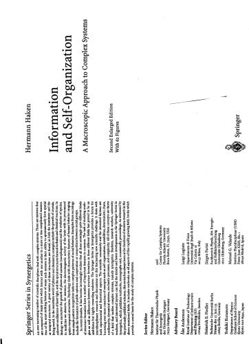 این کتاب مفاهیم مورد نیاز برای مقابله با سیستمهای پیچیده خودسازماندهی را از دیدگاهی یکپارچه ارائه میکند که از دادههای ماکروسکوپی استفاده میکند. معانی مختلف مفهوم “اطلاعات” مورد بحث قرار می گیرد و از یک فرمول کلی از اصل حداکثر اطلاعات (آنتروپی) استفاده می شود. با کمک نتایج حاصل از هم افزایی، محدودیت های هدف کافی برای کلاس بزرگی از سیستم های خودسازماندهی فرموله شده و نمونه هایی از فیزیک، زندگی و علوم کامپیوتر ارائه شده است. رابطه با نظریه آشوب مورد بررسی قرار می گیرد و بیشتر نشان داده می شود که بر اساس داده های احتمالاً کمیاب و پر سر و صدا، حدس های بی طرفانه در مورد فرآیندهای سیستم های پیچیده می توان انجام داد و نیروهای قطعی و تصادفی اساسی را تعیین کرد. این امکان پیشبینیهای احتمالی فرآیندها را با کاربرد در زمینههای متعدد در علم، فناوری، پزشکی و اقتصاد فراهم میکند. پسوندهای ویرایش سوم اساساً به مقدمهای بر معنای اطلاعات در زمینه کوانتومی اختصاص دارد. در واقع، علم و فناوری اطلاعات کوانتومی در حال حاضر یکی از فعال ترین زمینه های تحقیقاتی در رابط فیزیک، فناوری و علوم اطلاعات است و در حال حاضر خود را به عنوان یکی از فناوری های بزرگ آینده برای پردازش و انتقال اطلاعات در هر مقیاسی تثبیت کرده است.