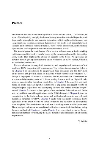 مدل آب کم عمق دوار (RSW) به عنوان یک ابزار مفهومی در دینامیک سیالات ژئوفیزیکی (GFD) کاربرد وسیعی دارد، زیرا علیرغم سادگی آن، حاوی تمام اجزای ضروری اتمسفر و دینامیک اقیانوس در مقیاس همدیدی، به ویژه در آن است. نسخه دو لایه (یا چند لایه). این کتاب پیشرفت‌های اخیر را در درک (در چارچوب RSW و مدل‌های مرتبط) برخی مسائل اساسی GFD، مانند وجود منیفولد آهسته، تقسیم دینامیکی حرکات سریع (امواج اینرسی-گرانشی) و آهسته (گرداب‌ها، امواج راسبی) توصیف می‌کند. تنظیم غیرخطی ژئوستروفیک و انتشار امواج، نقش پدیده های موجی اساسا غیرخطی. ویژگی کتاب این است که رویکردهای تحلیلی، عددی و تجربی با هم ارائه شده و مکمل یکدیگر هستند. توجه ویژه ای به توضیح روش شناسی می شود، به عنوان مثال. بسط مجانبی در مقیاس زمانی متعدد، میانگین‌گیری و حذف رزونانس‌ها، در مورد نظریه، طرح‌های حجم محدود با وضوح بالا، در مورد شبیه‌سازی‌های عددی، و آزمایش‌های صفحه گردان با سیالات طبقه‌بندی شده، در مورد شبیه‌سازی‌های آزمایشگاهی. یک مقدمه کلی در مورد GFD در ابتدا برای معرفی مشکلات برای افراد غیر متخصص ارائه شده است. در عین حال، نتایج جدید اخیر در مورد تنظیم غیرخطی زمین شناسی، امواج غیرخطی، و دینامیک استوایی، از جمله برخی نتایج دقیق در مورد وجود راه حل های منیفولد آهسته، شکست موج و موج غیرخطی برای اولین بار به صورت سیستماتیک ارائه شده است. ?· رویکردهای تحلیلی، عددی و تجربی را در زمینه دینامیک سیالات ژئوفیزیکی ترکیب می کند؟ ترکیبی از موارد ضروری در GFD، از توصیف روش های تحلیلی، عددی و تجربی (قسمت آموزشی)، و نتایج جدید به دست آمده با این روش ها (قسمت اصلی)؟ · ارتباط بین GFD و مکانیک (روش میانگین گیری، روش اشکال عادی) را فراهم می کند. GFD و فیزیک غیرخطی (شوک ها، سالیتون ها، مدون ها، حمل و نقل غیرعادی، امواج غیرخطی دوره ای)