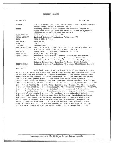 در جامعه‌ای که به‌طور فزاینده‌ای تکنولوژیک است، بهبود عملکرد دانش‌آموزان در ریاضیات و علوم به یک چالش حیاتی تبدیل شده است. در طول دهه 1990، بنیاد ملی علوم یک سری ابتکارات سیستمی را تأمین مالی کرد که برای تغییر روش تدریس این موضوعات در مدارس سراسر کشور طراحی شده بودند. این ابتکارات به دنبال همسویی تمام جنبه های سیستم آموزشی در حمایت از برنامه درسی بلندپروازانه و استانداردهای عملکرد، با تاکید ویژه بر تربیت معلم و توسعه حرفه ای برای ارتقای تغییرات موثر در عملکرد آموزشی بود.