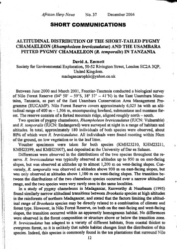 امت، دی (2004). توزیع ارتفاعی آفتاب پرست پیگمی دم کوتاه (Rhampholeon brevicaudatus) و آفتاب پرست پیگمی حفره دار Usambara (R. temporalis) در تانزانیا. اخبار هرپ آفریقایی، 37، 12-13.