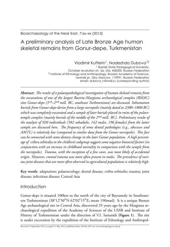 نتایج یک بررسی دیرینه‌آسیب‌شناسی بقایای اسکلتی انسان از کاوش‌های یکی از بزرگترین محوطه‌های باستان‌شناسی باکتریا-مارگیانا (BMAC) Gonur-depe (3rd–2nd میل. قبل از میلاد، جنوب شرقی ترکمنستان) بحث شده است. تدفین‌های گونور-دپه از یک گورستان بزرگ (عمدتاً مربوط به 2300-1800 قبل از میلاد) که به طور کامل حفاری شد و نمونه‌ای از تدفین‌های بعدی در ویرانه‌های مجموعه کاخ-معبد قرار گرفت (عمدتاً تدفین‌های اواسط قرن 2 قبل از میلاد). نتایج اولیه تجزیه و تحلیل 920 نفر (582 خرده بزرگسال، 142 مرد، 196 زن) از نمونه دوم در اینجا مورد بحث قرار می گیرد. فراوانی برخی از آسیب شناسی های دندانی (به عنوان مثال، آبسه و AMTL) نسبتا کم است (در مقایسه با داده های مشابه از گورستان گونور). این واقعیت را می توان با برخی تغییرات رژیم غذایی در جمعیت گونور بعدی مرتبط دانست. درصد بالایی از اوربیتالیا کریبرا در زیر گروه کودکان برخی از عوامل زیست اجتماعی منفی را نشان می دهد (در ارتباط با افزایش مرگ و میر کودکان در مقایسه با نمونه از گورستان). تروما، به استثنای چند مورد، به احتمال زیاد منشأ تصادفی داشته است. با این حال، ترومای جمجمه بیشتر در مردان وجود داشت. شیوع بیماری های مختلف مفصلی که بیشتر در جمعیت های کشاورزی مشاهده می شود نسبتاً زیاد است.
