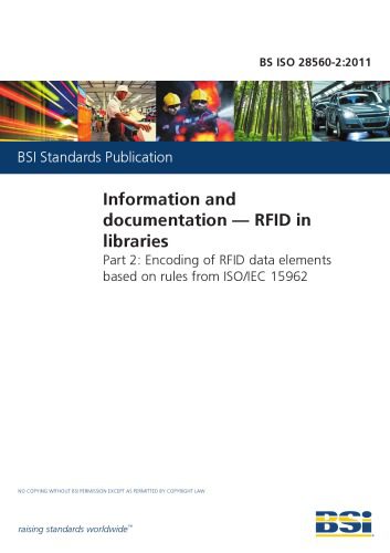 | عنوان اصلی | BS ISO 28560-2:2011 Information and documentation. RFID in libraries. Encoding of RFID data elements based on rules from ISO/IEC 15962 |