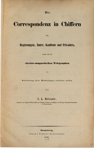 عنوان اصلی | Die Correspondenz [Korrespondenz] in Chiffern [Chiffren] für Regierungen, Ämter, Kaufleuteund Privatiers, welche sich der elektro-magnetischen Telegrahen zur Beförderung ihrer Nachrichten bedienen wollen |