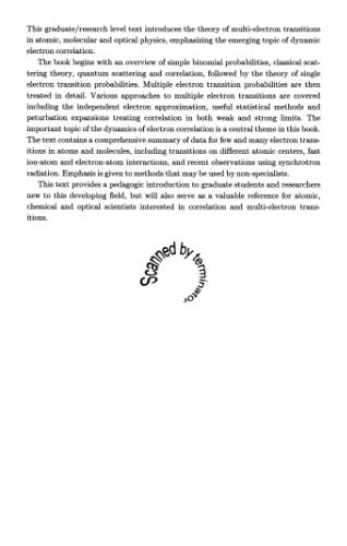 این متن در سطح فارغ التحصیل/تحقیق، نظریه انتقال چند الکترون را در فیزیک اتمی، مولکولی و نوری معرفی می‌کند و بر موضوع نوظهور همبستگی الکترون‌های دینامیکی تأکید می‌کند. این کتاب با مروری بر احتمالات دو جمله ای ساده، نظریه پراکندگی کلاسیک، پراکندگی کوانتومی و همبستگی، و به دنبال آن نظریه احتمالات انتقال تک الکترون آغاز می شود. احتمالات انتقال الکترون های متعدد سپس به تفصیل بررسی می شوند. روش‌های مختلفی برای انتقال الکترون‌های متعدد از جمله تقریب الکترون مستقل، روش‌های آماری مفید و بسط‌های اغتشاش که همبستگی را در حد ضعیف و قوی درمان می‌کنند، پوشش داده شده‌اند. دینامیک همبستگی الکترون به شدت مورد تاکید است. این متن حاوی خلاصه‌ای جامع از داده‌های انتقال چند و چند الکترونی در اتم‌ها و مولکول‌ها، از جمله انتقال در مراکز مختلف اتمی، برهمکنش‌های سریع یون-اتم و الکترون-اتم، و مشاهدات اخیر با استفاده از تابش سنکروترون است. تاکید بر روش هایی است که ممکن است توسط افراد غیرمتخصص استفاده شود.