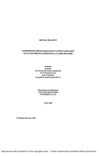 در قرن سیزدهم، روحانیون از یک شبه انحصار در ادبیات برخوردار بودند. آنها دیدگاه خود از جهان را در چرخه لنسلوت-گریل ثبت کردند، که آخرین کتاب آن، La mort le roi Artu، پیروزی ایدئولوژیک روحانیت بر طبقه نظامی را تشکیل می دهد. با مطالعه کتیبه ایدئولوژیک می توان چندین اثر از روحانیون در جریان این مبارزه ایدئولوژیک به رهبری آنها علیه جامعه جوانمردی را شناسایی کرد. مرگ شاه آرتو، به عنوان نقطه اوج این چرخه، نقش مهمی ایفا می کند، زیرا مسیحی شدن اسطوره آرتوری و همچنین تقدیس شخصیت ها به لطف انکار قرن را نشان می دهد. کار ما پس از تبیین نظریه سه راسته، چندین جنبه (متون تاریخی، راوی، روایت، شخصیتها، ساختار) مورت آرتو را تحلیل میکند و در عین حال سعی در برجسته کردن ایدئولوژی روحانی دارد. در نهایت، این مسئله نشان می دهد که چگونه این آخرین ویزای ارائه تابع دوم، کلاس نظامی، به تابع اول، طبقه مذهبی است.