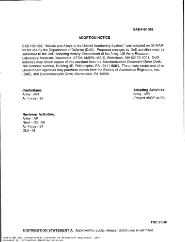 حاوی بیش از 4800 نام فلز و آلیاژ است. فلزات و آلیاژها در سیستم شمارهگذاری یکپارچه، ویرایش هشتم (UNS) ابزاری را برای همبستگی بسیاری از سیستمهای شمارهگذاری فلزات و آلیاژهای مورد استفاده ملی که در حال حاضر توسط جوامع، انجمنهای تجاری و آن دسته از کاربران و تولیدکنندگان فلزات و آلیاژها اداره میشوند، فراهم میکند.