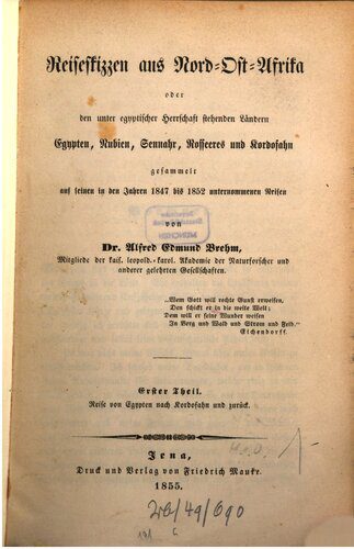 | عنوان اصلی | Reiseskizzen aus Nordost-Afrika oder den unter ägyptischer Herrschaft stehenden Ländern Ägypten, Nubien, Sennahr, Rosseres und Kordofan gesammelt auf seinen in den Jahren 1847 bis 1852 unternommenen Reisen |