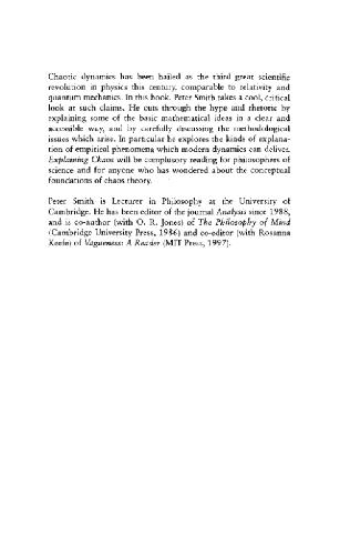 دینامیک هرج و مرج به عنوان سومین انقلاب علمی بزرگ در فیزیک در این قرن مورد ستایش قرار گرفته است که با نسبیت و مکانیک کوانتومی قابل مقایسه است. در این کتاب، پیتر اسمیت نگاهی سرد و انتقادی به چنین ادعاهایی دارد. او با تبیین برخی از ایدههای اساسی ریاضی به شیوهای واضح و قابل دسترس و با بحث دقیق درباره مسائل روششناختی که به وجود میآیند، هیاهو و بلاغت را قطع میکند. به ویژه، او انواع جدیدی از تبیین پدیده های تجربی را که دینامیک مدرن می تواند ارائه دهد، بررسی می کند. توضیح آشوب برای فیلسوفان علم و برای هر کسی که در مورد مبانی مفهومی نظریه آشوب تعجب کرده است، خواندن اجباری خواهد بود.