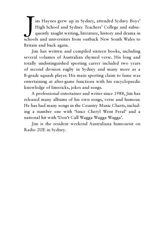همه حداقل یک لیمریک را می شناسند. در اینجا تمام عباراتی است که می توانید به خاطر بسپارید، و بسیاری از آنها را که نمی توانید به خاطر بیاورید اما آرزو می کردید که می توانستید در اینجا وجود دارد – از دوران کودکی تا برخی از بزرگسالان. جیم هاینز بیش از هزار لیمریک را بر اساس نوع ترتیب داده است – شوخ و غریب، کودکانه و جذاب، زبانی و منطقی، دینکم و خنده دار، برمیزی و انگلیسی. بت ها و نمادهای استرالیایی، نام مکان ها و نخست وزیران با تمام شکوه تاریخی و طنز خود رژه می روند. برخی از لیمرها، هر چند شوخ، به طرز شادی آور، مبتذل، یا حتی کاملاً خام هستند – دسته بندی هایی که به طور متفکرانه در نظر گرفته شده اند، از نسبتاً بی ادبانه و بی حیا گرفته تا نمونه های زشت و نفرت انگیز مورد علاقه باشگاه های راگبی و پسران نوجوان در تمام سنین. همه نشان می دهند که لیمریک جشنی از زندگی، مزخرفات و انرژی دلپذیر است.