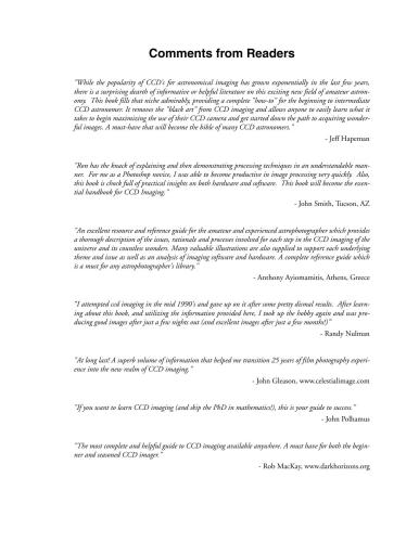 این کتاب همه چیزهایی را که باید بدانید را پوشش می دهد: دوربین CCD چگونه کار می کند. نحوه دستیابی به تمرکز انتقادی؛ نحوه انتخاب تجهیزات مناسب (لوله، تلسکوپ و دوربین CCD)؛ نحوه هدایت خودکار و موارد دیگر.