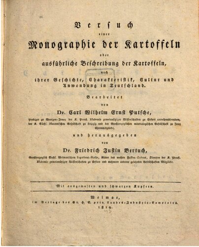 عنوان اصلی | Versuch einer Monographie der Kartoffeln oder ausführliche Beschreibung der Kartoffeln, nach ihrer Geschichte, Charakteristik, Cultur und Anwendung in Deutschland |