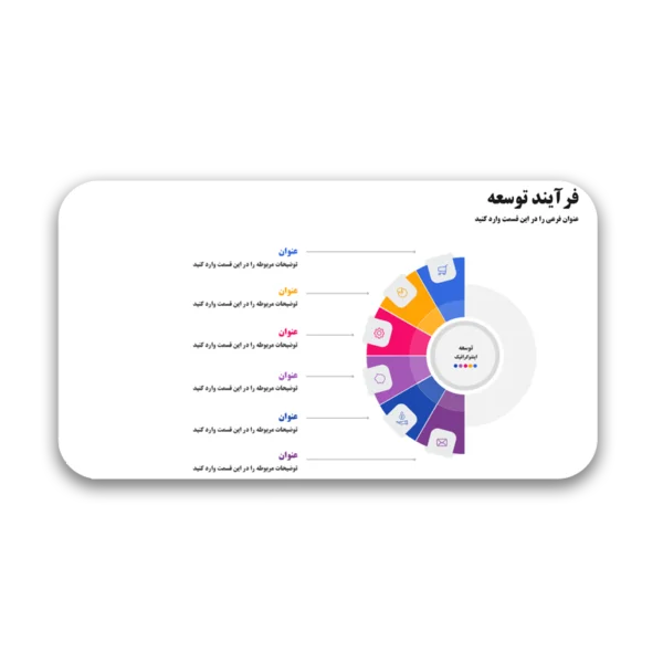 قالب پاورپوینت فرآیند توسعه با ترکیب رنگ‌های متنوع و جذاب، برای انواع ارائه‌ها از جمله ارائه‌های تجاری، جلسات کاری، پروژه‌های تحقیقاتی و آموزشی مناسب است. این قالب به شما امکان می‌دهد تا محتواهای پیچیده را به صورت تصویری و اینفوگرافیک به نمایش بگذارید که درک آن برای مخاطبان آسان‌تر خواهد بود. استفاده از این قالب به شما کمک می‌کند تا ارائه‌ای تاثیرگذار و حرفه‌ای داشته باشید که در ذهن مخاطبان ماندگار باشد.