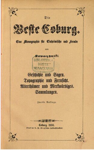 عنوان اصلیDie Veste Coburg. Eine Monographie für Einheimische und Fremde ; Geschichte und Sagen. Topographie und Fernsicht. Altertümer und Merkwürdiges. Sammlungen