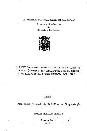 مورالس دی (1977) بررسیهای باستانشناسی در دشتهای نمکی سان بلاس (جونین) و پیامدهای آن در دوره شکلگیری ارتفاعات مرکزی پرو. پایان نامه کارشناسی باستان شناسی، لیما، دانشگاه ملی سن مارکوس.