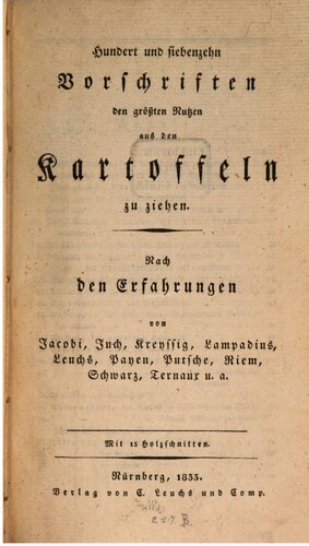 عنوان اصلی | Hundert und siebzehn Vorschriften den größten Nutzen aus den Kartoffeln zu ziehen. Nach den Erfahrungen von Jacobi, Juch, Kreyssig, Lampadius, Leuchs, Payen, Putsche, Riem, Schwarze, Ternauz u.a. |