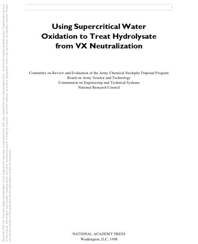 ارتش ایالات متحده از شورای تحقیقات ملی (NRC) خواسته است تا ارزیابی کند که آیا اکسیداسیون آب فوق بحرانی (SCWO) یک وسیله موثر و مناسب برای از بین بردن ترکیبات آلی خطرناک یا سمی در هیدرولیز VX برای دفع نهایی است یا خیر. از NRC خواسته نشد که یک تجزیه و تحلیل عمیق از کل فرآیند یکپارچه تخریب و دفع عامل فله VX برای تأسیسات دفع عامل شیمیایی نیوپورت انجام دهد. همانطور که طراحی تاسیسات در حال نهایی شدن است (مارس 1999-آوریل 2000)، احتمالا از NRC خواسته می شود تا تمام جنبه های طراحی تاسیسات، از جمله نظارت، مهار، کنترل فرآیند، و افزونگی، و همچنین ارزیابی کمی ریسک (QRA) را ارزیابی کند. ). این گزارش عناصر فناوری خنثیسازی/SCWO پیشنهادی را تشریح میکند، نتایج آزمایشهای جاری SCWO را ارزیابی میکند، و توصیههایی در مورد جنبههایی از فناوری که نیاز به توسعه بیشتر دارد، ارائه میکند. دامنه این ارزیابی شامل ارزیابی سایر فناوریهای بالقوه یا گزینههای مدیریتی برای تصفیه هیدرولیز VX نمیشود.