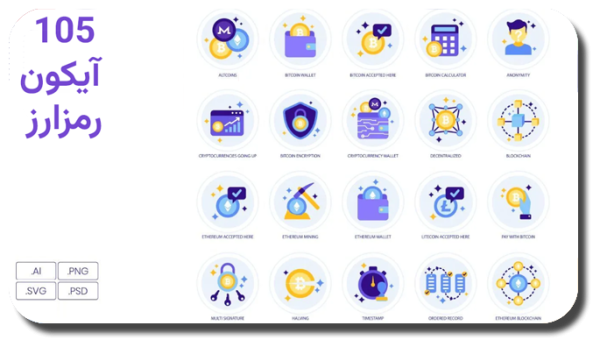خرید و دانلود نسخه کامل مجموعه 105 آیکون وکتور با موضوع بیت کوین – مناسب برای طراحان گرافیکی