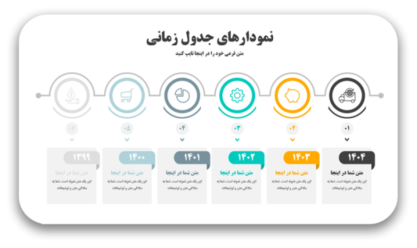 با مشاهده تصاویر این قالب پاورپوینت (12 تصویر برای 100 اسلاید) میتوانید به صحت ادعای ما در این مورد پی ببرید و مطمئن شوید که طراحیهای صورت گرفته در این قالب پاورپوینت خط زمانی، تمام نیازهای شما را پوشش میدهد.